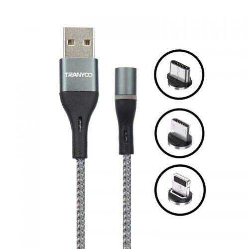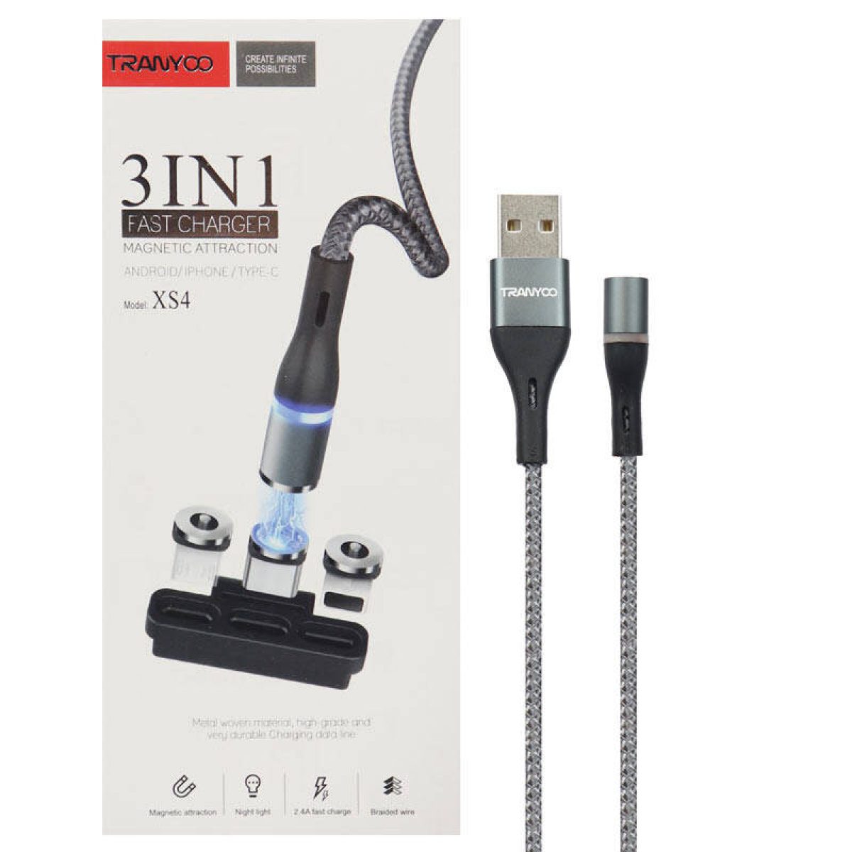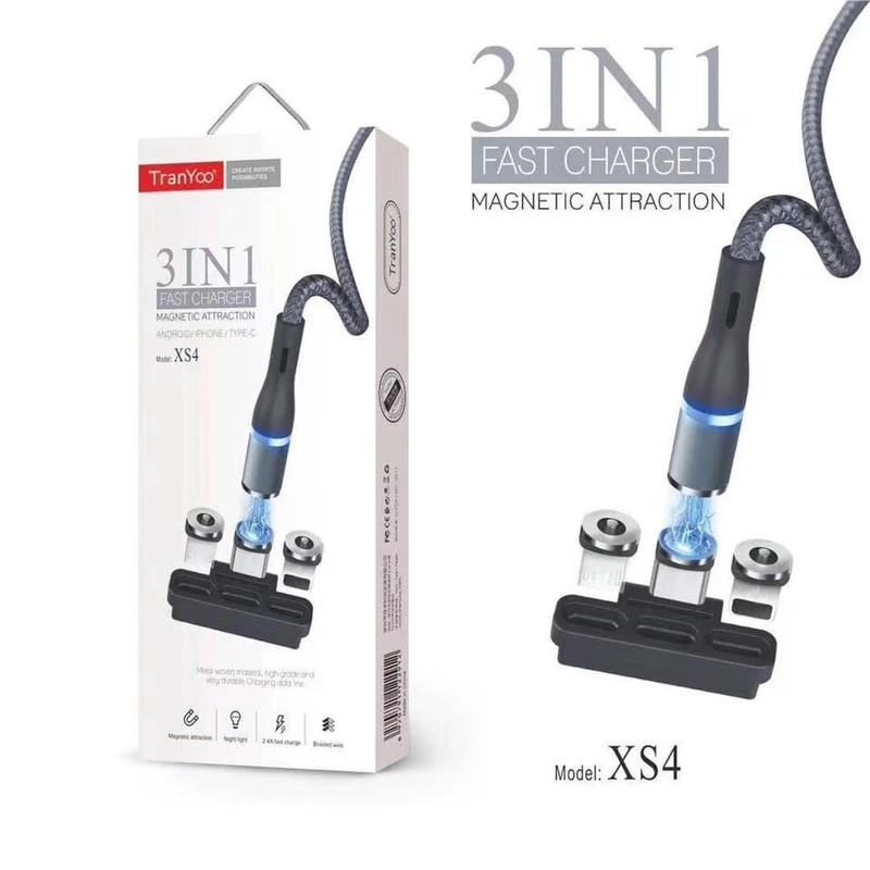 امروزه گوشی های موبایل، تبلت ها و دیگر دستگاه های دیجیتال دارای سه پورت شارژ لایتنینگ ، میکرو یو اس بی و تایپ سی می باشند که شما برای شارژ هر کدام از این دستگاه ها باید کابل مخصوص به آن را با خود داشته باشید. کمپانی Tranyoo که یک کمپانی برجسته و محبوب در زمینه ی ساخت اکسسوری محصولات دیجیتالی می باشد با ساخت کابل مدل XS4 باعث شده تا شما بتوانید با به همراه داشتن یک کابل هر گوشی، تبلت، هدست بلوتوثی و… را شارژ کنید. این کابل دارای کانکتور های Lightning ، Type-C و Micro USB بوده که به وسیله ی آهنربای بسیار قوی به کابل اصلی متصل می شود و به شما این امکان را می دهد تا هر نوع گوشی موبایل، تبلت و… را با شدت جریان و ولتاژ 5V-2.4A شارژ کنید. بدنه این محصول دارای روکشی از الیاف در هم تنیده بوده که مقاومت مطلوبی در برابر کشش و پارگی دارد. طول این کابل 100 سانتی متر بوده که برای استفاده های روزمره بسیار مناسب می باشد و نه محدودیتی برای کاربر و نه مزاحمتی برای آن به وجود می آورد.